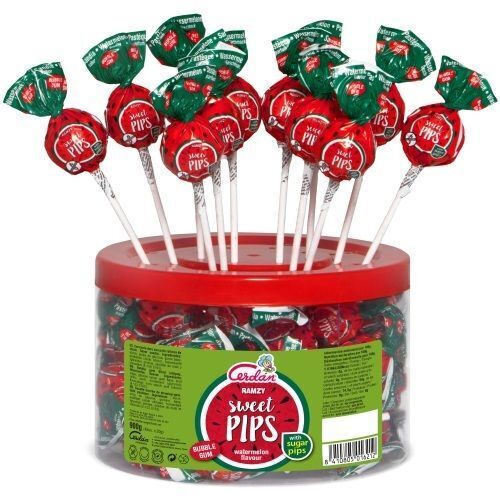 Sucette de 20g avec des pépites de sucre et fourrée avec un chewing-gum, parfum pastèque.
